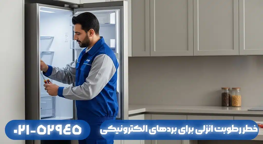 برد الکترونیکی (PCB) یخچال سامسونگ، صفحه‌ای سبز رنگ پر از مسیرهای مسی نازک، چیپ‌های میکروسکوپی، خازن‌ها و مقاومت‌ها است. این قطعات با ولتاژهای بسیار دقیق (گاهی ۵ ولت یا ۳.۳ ولت) با هم صحبت می‌کنند. رطوبت انزلی چطور به این شهر مینیاتوری حمله می‌کند؟